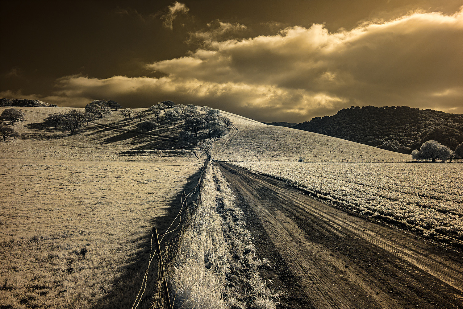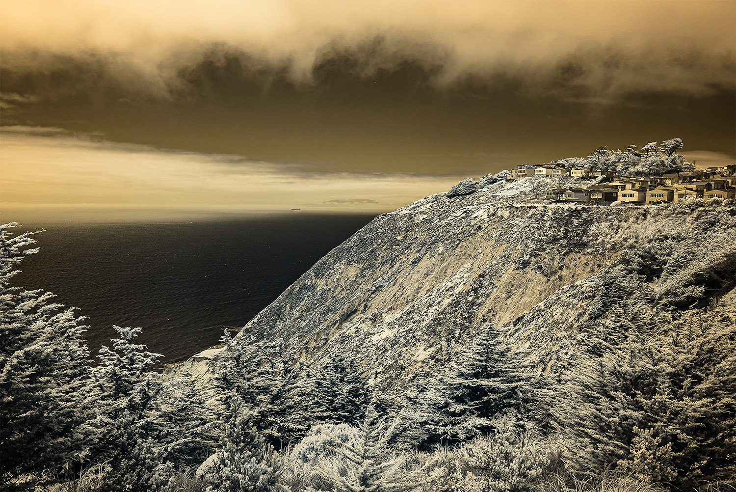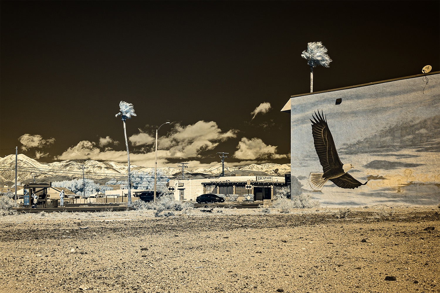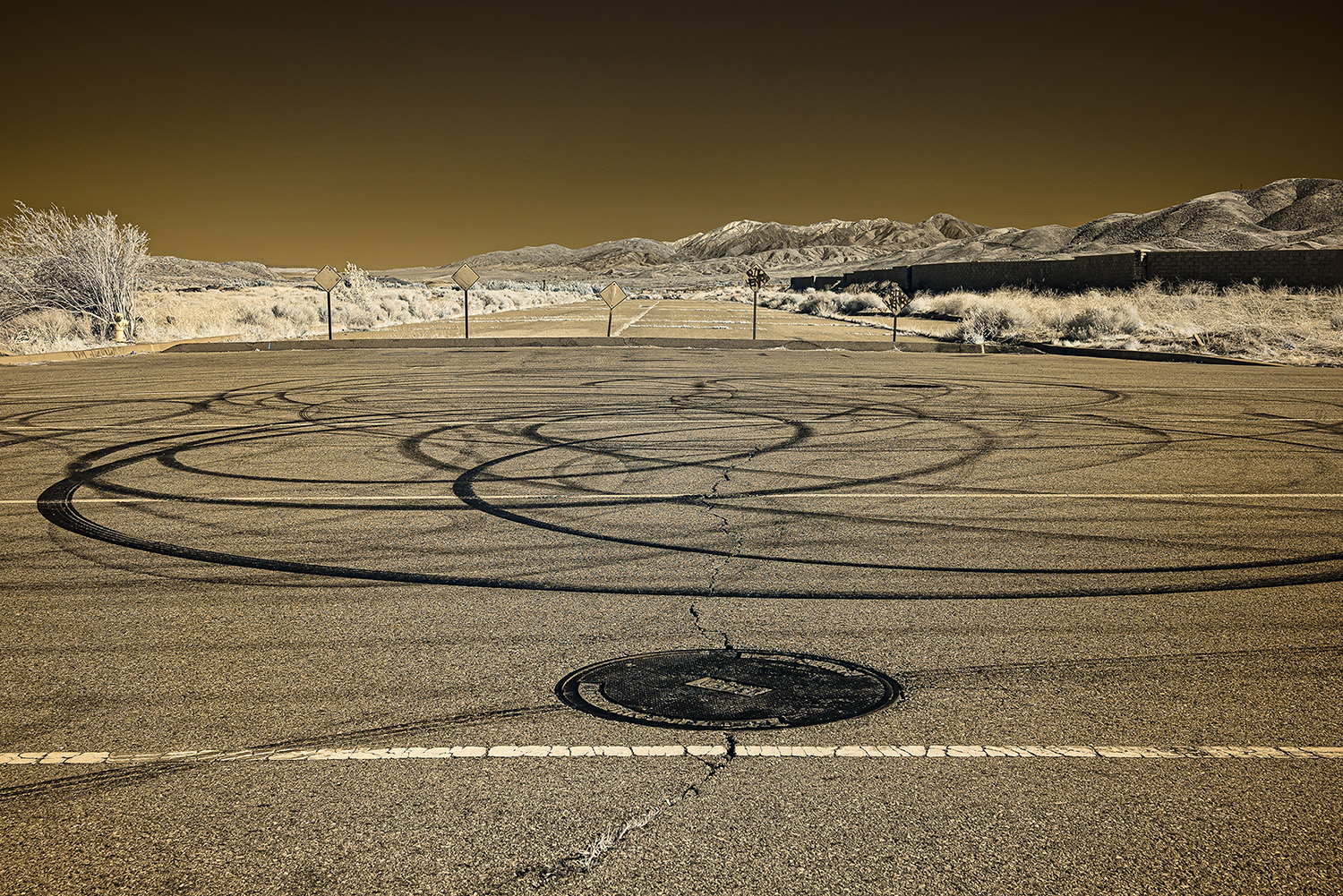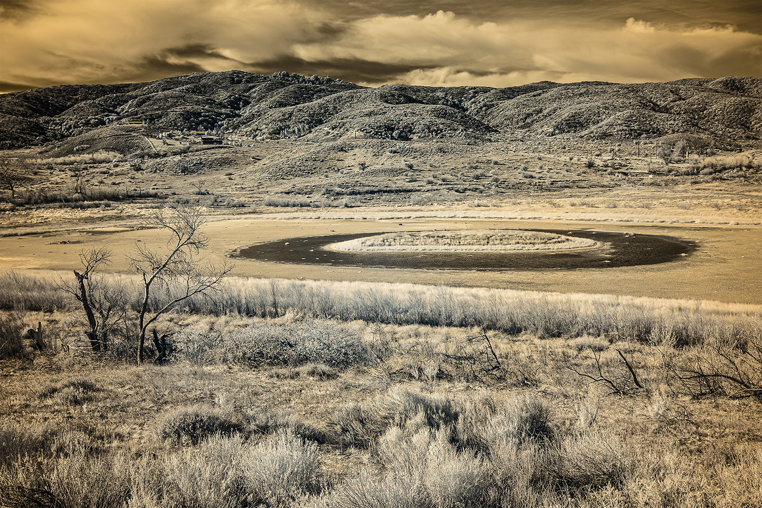 Using an infrared camera to capture light beyond the visible spectrum, I reveal the unseen—offering a glimpse into alternative perspectives that exist beyond our own viewpoints. The gold tones in the images evoke California’s paradoxical identity as the Golden State: a place where the promise of prosperity coexists with deep fractures, in both the land and the culture.